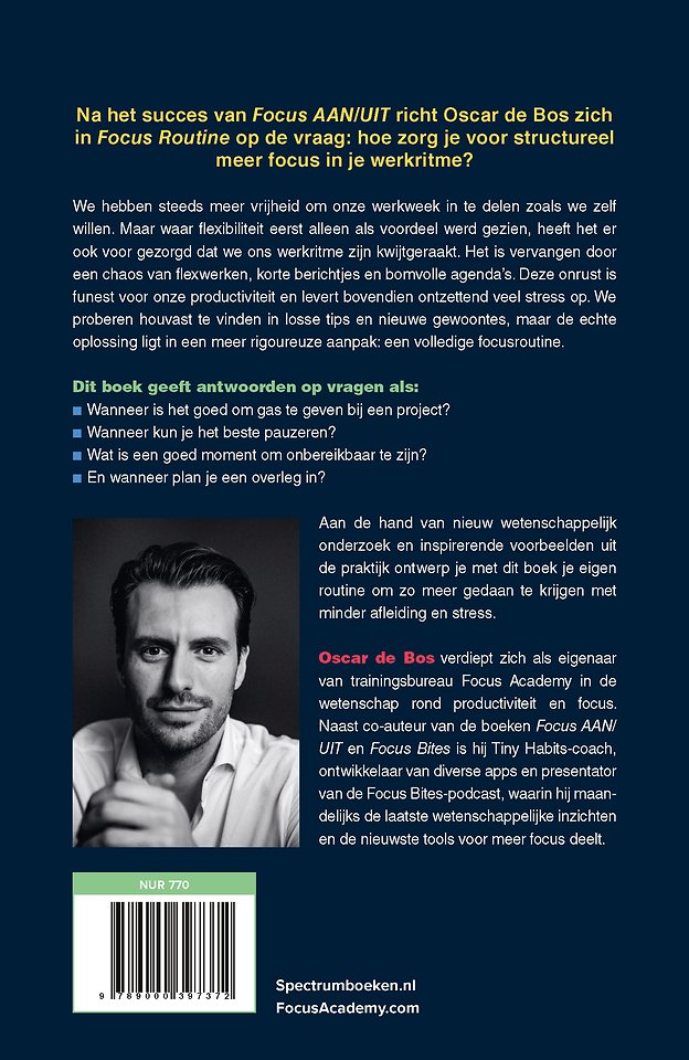 Meer over Oscar de BosNa het overweldigende succes van Focus AAN/UIT gaat Oscar de Bos in Focus routine dieper in op de vraag: hoe zorg je voor meer focus in je werkritme? Aan de hand van verschillende thema’s, nieuw wetenschappelijk onderzoek en inspirerende voorbeelden uit de praktijk ontwerp je je eigen routine om zo meer gedaan te krijgen met minder stress.