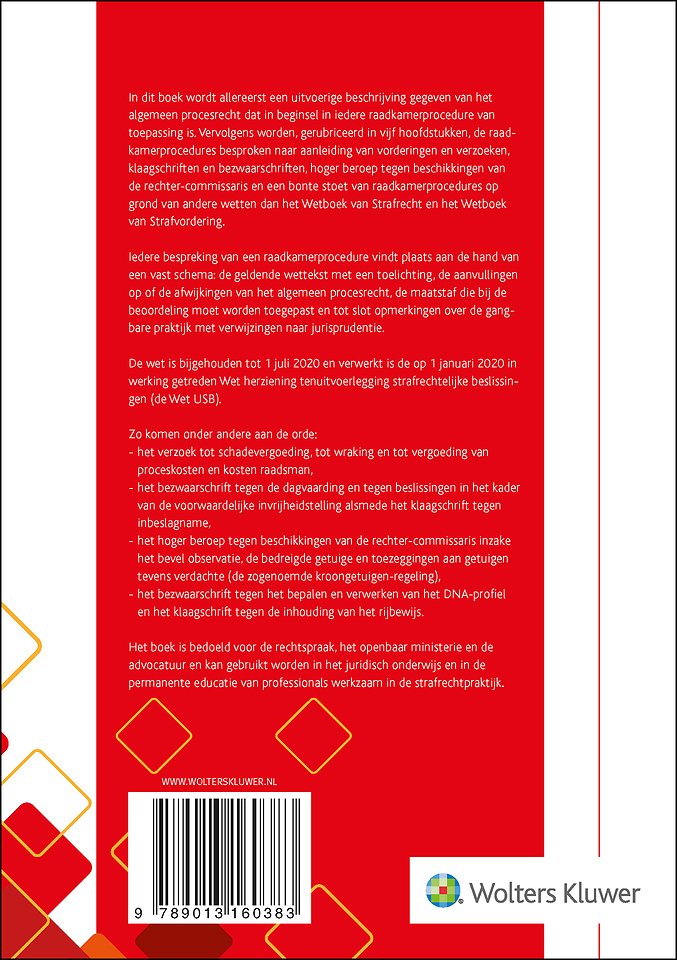 Geen andere uitgave biedt een dergelijk complete behandeling van de afzonderlijke raadkamerprocedures en het daarvoor geldende procesrecht als De raadkamerprocedures in strafzaken. De titel brengt orde in de talrijke raadkamerprocedures die betrekking hebben op strafzaken. Deze procedures staan vermeld in het Wetboek van Strafrecht, het Wetboek van Strafvordering en vele andere wetten.
