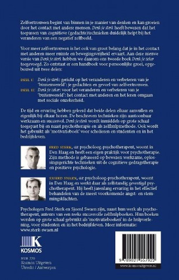 Zelfvertrouwen begint van binnen in uw manier van denken en kan groeien door het contact met andere mensen. 'Denk je sterk' heeft bewezen dat het toepassen van cognitieve (gedachte)technieken duidelijk helpt bij het veranderen van een negatief zelfbeeld. Voor meer zelfvertrouwen is het ook van groot belang dat u in het contact met anderen meer ruimte en bewegingsvrijheid ervaart. Daarom is dit boek een combinatie van twee eerder verschenen boeken 'Denk je sterk' en 'Denk je zeker'. Zo ontstaat er een handboek voor persoonlijke groei, opgebouwd uit twee delen: