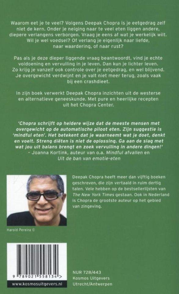 Waarom eet je eigenlijk zoveel? Wil je voedsel? Of liefde? Eigenwaarde? Of rust? Deepak Chopra helpt je het probleem bloot te leggen en op te lossen, met als resultaat een lichter leven, zonder overgewicht. Deepak Chopra combineert zijn kennis als arts met jarenlange ervaring als spiritueel leider om gewichtsproblemen aan te pakken.