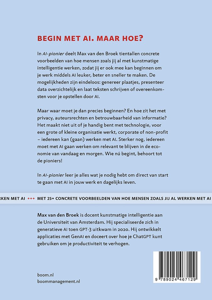In AI-pionier deelt Max van den Broek tientallen concrete voorbeelden van hoe mensen zoals jij al met kunstmatige intelligentie werken, zodat jij er ook mee kan beginnen om je werk middels AI leuker, beter en sneller te maken. De mogelijkheden zijn eindeloos: genereer plaatjes, presenteer data overzichtelijk en laat teksten schrijven of overeenkomsten voor je opstellen door AI.