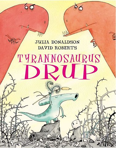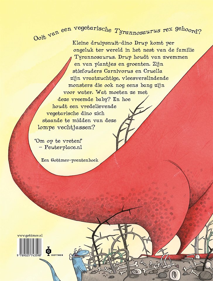 Ooit van een vegetarische Tyrannosaurus rex gehoord? Iedereen weet dat de Tyrannosaurus een groot, eng, vleesverslindend beest is. De verwarring is dan ook compleet als er een vredelievend druipsnuit-dinosaurusje uit het ei kruipt in het nest van de familie Tyrannosaurus. Wat moeten vader Carnivorus en moeder Cruella met dit vegetarische kind, dat alleen natte sla wil? En wat moet kleine Drup te midden van deze vraatzuchtige monsters? De hilarische tekst van Julia Donaldson is op formidabele wijze vertaald door Bette Westera: