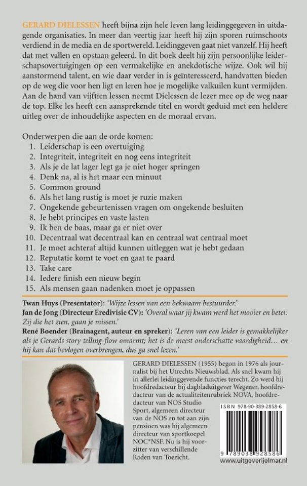 Gerard Dielessen heeft als directeur bij zowel de NOS als bij NOC*NSF gewerkt met mensen waarbij de lat hoog lag. Leidinggeven gaat niet vanzelf. Hij heeft dat met vallen en opstaan geleerd. Zijn mensen moesten onder het alziende oog van het publiek een topprestatie leveren. Dielessen bedacht de strategie, hij creëerde de voorwaarden en hij zorgde dat het werk werd gedaan.