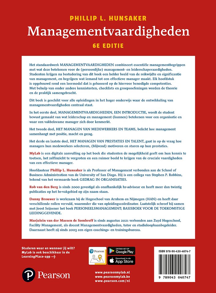 Het standaardwerk MANAGEMENTVAARDIGHEDEN combineert essentiële managementbegrippen met wat deze betekenen voor de (persoonlijke) management- en leiderschapsvaardigheden. Studenten krijgen na bestudering van dit boek een helder beeld van de reikwijdte en significantie van management, en begrijpen wat iemand tot een effectieve manager maakt. Elk hoofdstuk is opgebouwd rond een leermodel dat is gebaseerd op de hiervoor benodigde competenties. Met behulp van onder andere kennistesten, checklists en groepsoefeningen worden de theorie en de praktijk samengebracht.