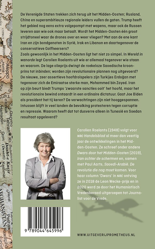 De Verenigde Staten trekken zich terug uit het Midden-Oosten; Rusland, China en superambitieuze regionale leiders vullen de gaten. Trump heeft het gebied nog eens extra volgepompt met wapens, maar ook de Russen leveren aan wie ook maar betaalt. Wordt het Midden-Oosten één groot strijdtoneel waar de drones over en weer vliegen? Met aan de ene kant Iran en zijn bondgenoten in Syrië, Irak en Libanon en daartegenover de conservatieve Golfheersers? Zoals gewoonlijk in het Midden-Oosten ligt het niet zo simpel. In Wereld in wanorde legt Carolien Roelants uit wie er allemaal tegenover wie staan en waarom. De lage olieprijs dwingt de roekeloze Saoedische kroonprins tot inbinden; worden zijn revolutionaire plannen nog uitgevoerd? De nieuwe, zeer assertieve hoofdrolspelers zijn Turkijes Erdoğan met tegenover zich de Emiraatse sterke man, Mohammed bin Zayed. Iran op zijn beurt biedt Trumps ‘zwaarste sancties ooit’ het hoofd, maar het revolutionaire bewind ontaardt in een ordinaire dictatuur. Gaat Joe Biden als president het tij keren? De verwachtingen zijn niet hooggespannen. Intussen blijft in veel landen de bevolking protesteren tegen corruptie en repressie. Waarom heeft dat tot dusverre alleen in Tunesië en Soedan resultaat opgeleverd? Carolien Roelants (1948) volgt voor NRC Handelsblad al meer dan veertig jaar de ontwikkelingen in het Midden-Oosten. Ze schreef onder andere Dwars door het Midden-Oosten (2019), Iran achter de schermen en, samen met Paul Aarts, Saoedi-Arabië. De revolutie die nog moet komen. Voor haar column ‘Dwars’ in NRC ontving ze in 2018 de Leon Wecke-prijs en in 2020 werd ze door het Humanistisch Vredesberaad uitgeroepen tot Journalist voor de Vrede.