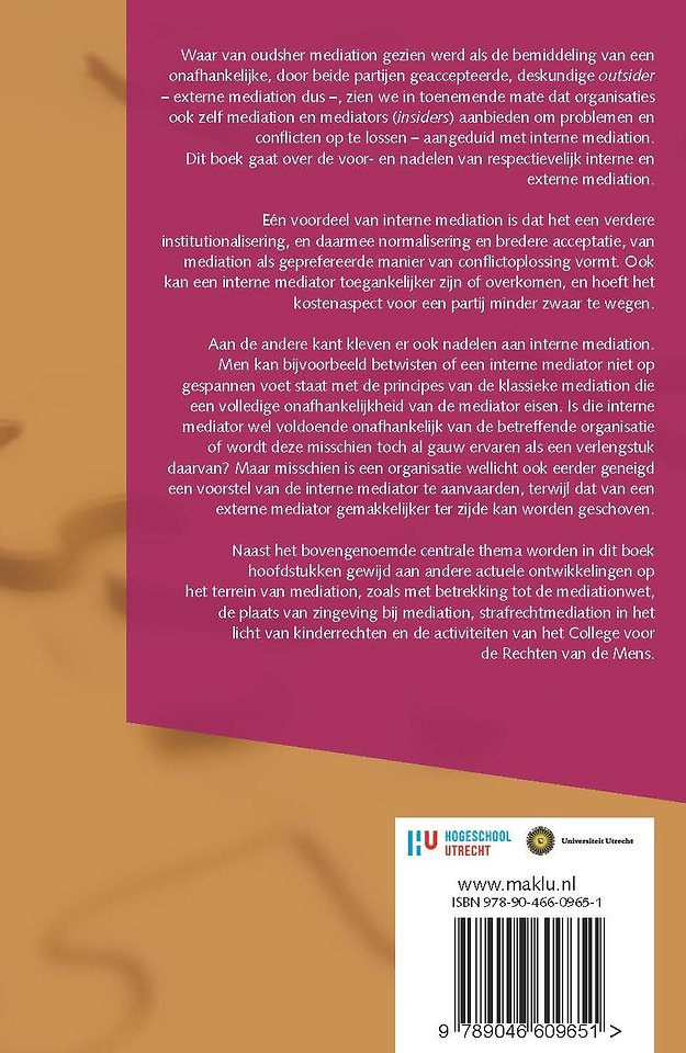 Waar van oudsher mediation gezien werd als de bemiddeling van een onafhankelijke, door beide partijen geaccepteerde, deskundige outsider– externe mediation dus –, zien we in toenemende mate dat organisaties ook zelf mediation en mediators (insiders) aanbieden om problemen en conflicten op te lossen – aangeduid met interne mediation. Dit boek gaat over de voor- en nadelen van respectievelijk interne en externe mediation.