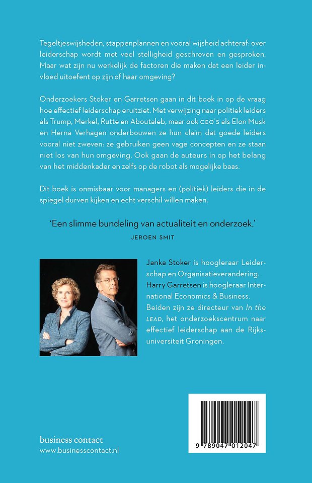 Stoker en Garretsen gaan in dit boek in op de vraag hoe effectief leiderschap eruitziet. Met verwijzing naar politiek leiders als Trump, Merkel, Rutte en Aboutaleb, maar ook CEO’s als Elon Musk en Herna Verhagen onderbouwen ze hun claim dat goede leiders vooral niet zweven: ze gebruiken geen vage concepten en ze staan niet los van hun omgeving. Ook gaan de auteurs in op het belang van het middenkader en zelfs op de robot als mogelijke baas.