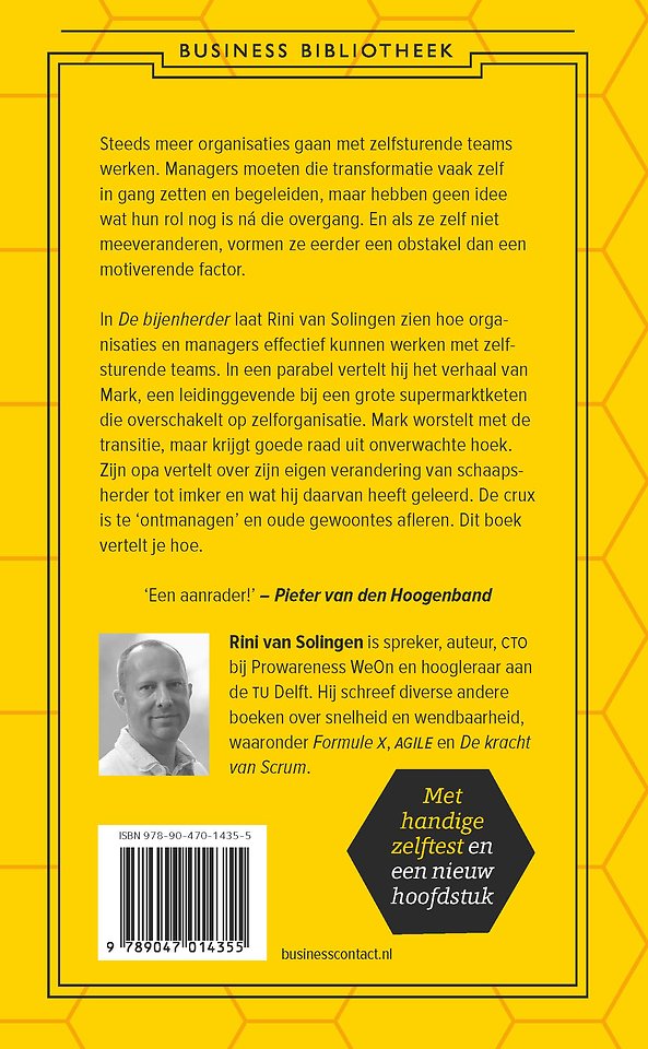 Meer over Rini van SolingenIn 'De bijenherder' laat Rini van Solingen zien hoe organisaties en managers effectief kunnen werken met zelfsturende teams. In een parabel vertelt hij het verhaal van Mark, een leidinggevende bijeen grote supermarktketen die overschakelt op zelforganisatie.