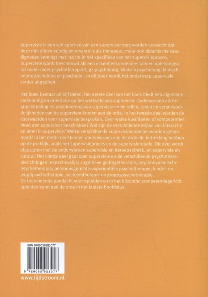 Supervisie is een vak apart en van een supervisor mag worden verwacht dat deze niet alleen kundig en ervaren is als therapeut, maar ook didactische vaardigheden verenigt met inzicht in het specifieke van het supervisieproces. Supervisie wordt beschouwd als een essentieel onderdeel binnen opleidingen tot onder meer psychotherapeut, gz-psycholoog, klinisch psycholoog, klinisch neuropsycholoog en psychiater. In dit boek wordt het onderwerp supervisie verder uitgediept.
