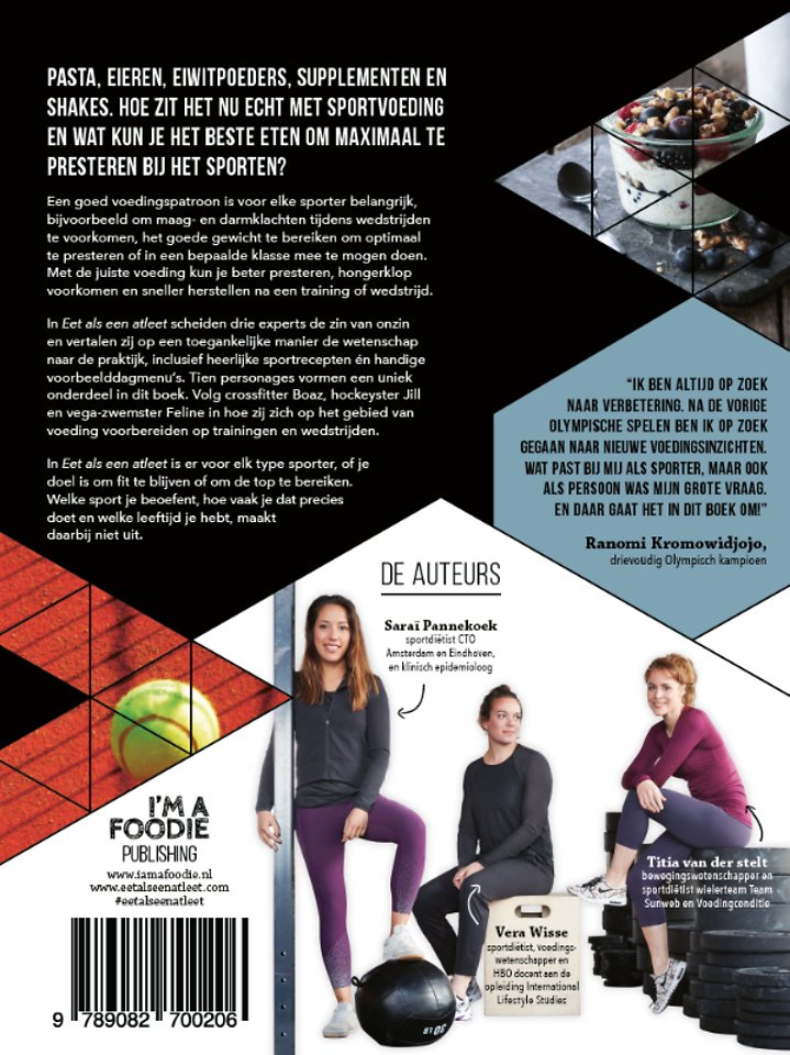In Eet als een atleet scheiden drie experts de zin van onzin en vertalen zij op toegankelijke wijze de wetenschap naar de praktijk, inclusief heerlijke sportrecepten én handige voorbeelddagmenu's. Tien personages vormen een uniek onderdeel in dit boek. Volg crossfitter Boaz, hockeyster Jill en vega-zwemster Feline in hoe zij zich op het gebied van voeding voorbereiden op trainingen en wedstrijden.