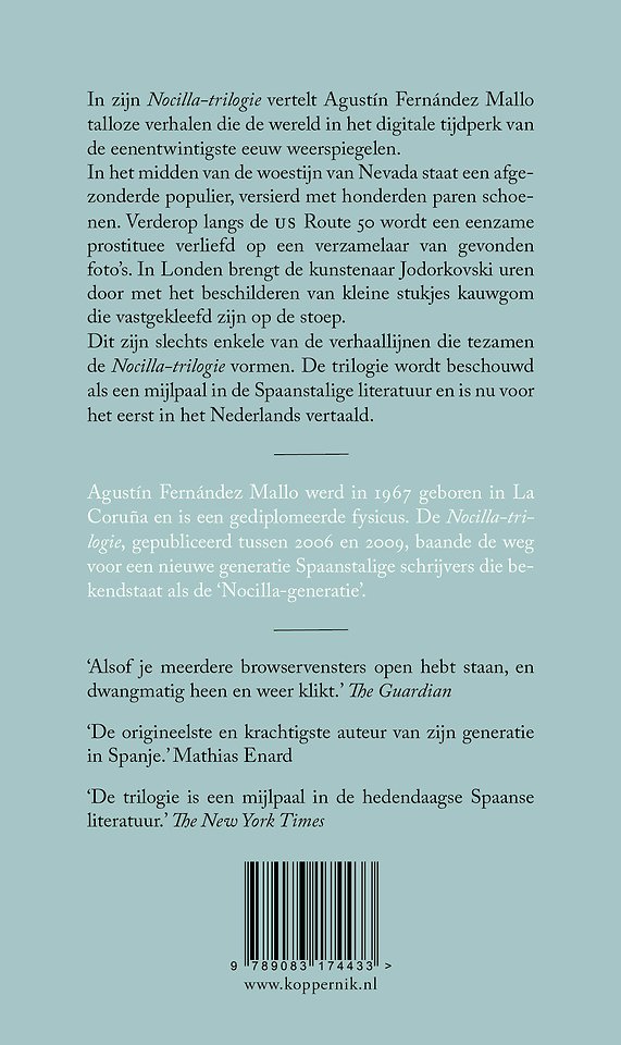 In zijn Nocilla-trilogie – Nocilla Dream, Nocilla Experience en Nocilla Lab – voert Agustín Fernández Mallo talloze verhalen op van mensen en plaatsen die Amerika en de wereld in het digitale tijdperk van de eenentwintigste eeuw weerspiegelen.