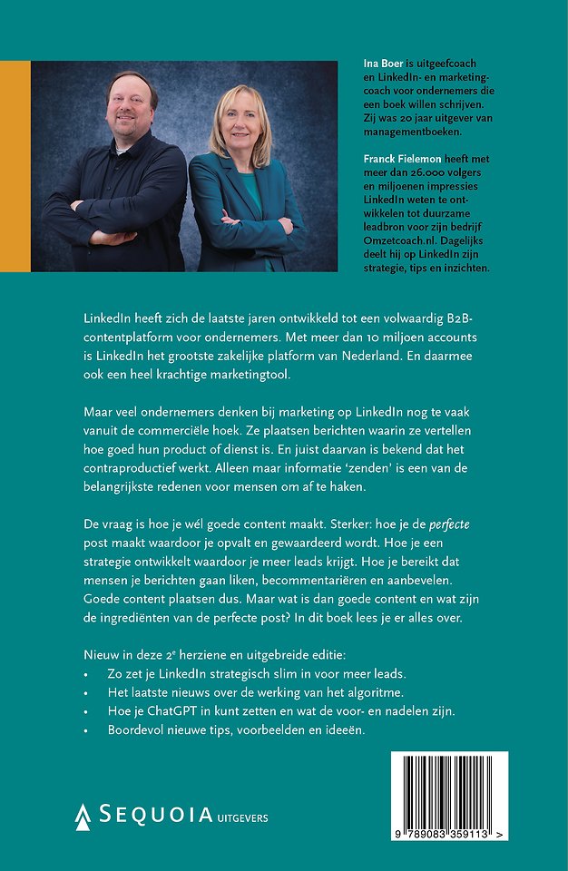 Meer over de auteursLinkedIn heeft zich de laatste jaren ontwikkeld tot een volwaardig B2B-contentplatform voor ondernemers. Met meer dan 10 miljoen accounts is LinkedIn het grootste zakelijke platform van Nederland. En daarmee ook een heel krachtige marketingtool. Maar veel ondernemers denken bij marketing op LinkedIn nog te vaak vanuit de commerciële hoek. Ze plaatsen berichten waarin ze vertellen hoe goed hun product of dienst is. En juist daarvan is bekend dat het contraproductief werkt. Alleen maar informatie 'zenden' is een van de belangrijkste redenen voor mensen om af te haken. De vraag is hoe je wél goede content maakt. Sterker: hoe je de perfecte post maakt waardoor je opvalt en gewaardeerd wordt. Hoe je een strategie ontwikkelt waardoor je meer leads krijgt. Hoe je bereikt dat mensen je berichten gaan liken, becommentariëren en aanbevelen. Goede content plaatsen dus. Makkelijker gezegd dan gedaan. Wat is dan goede content en wat zijn de ingrediënten van de perfecte post? En hoe maak je die? In dit boek lees je er alles over. Wat is er nieuw aan deze 2e herziene en uitgebreide editie? • Zo zet je LinkedIn strategisch slim in voor meer leads. • Het laatste nieuws over de werking van het algoritme. • Een nieuw hoofdstuk over hoe je ChatGPT kunt gebruiken bij het maken van content. • En heel veel nieuwe voorbeelden van succesvolle posts.