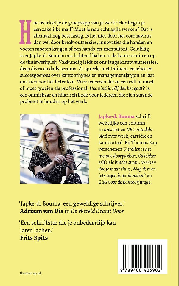 Gelukkig is er Japke- d. Bouma. Juist in deze ontwrichtende tijd is zij ons lichtend baken op het werk én op de thuiswerkplek. Vakkundig leidt ze ons langs brown paper sessies, deep dives en daily scrums. Ze spreekt met trainers, coaches en succesgoeroes over kantoorhypes en managementjargon en laat ons zien hoe het beter kan.