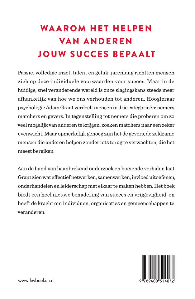 Meer over Adam GrantPassie, volledige inzet, talent en geluk: jarenlang richtten mensen zich op deze individuele voorwaarden voor succes. Maar in de huidige, snel veranderende wereld is onze slagingskans steeds meer afhankelijk van hoe we ons verhouden tot anderen.