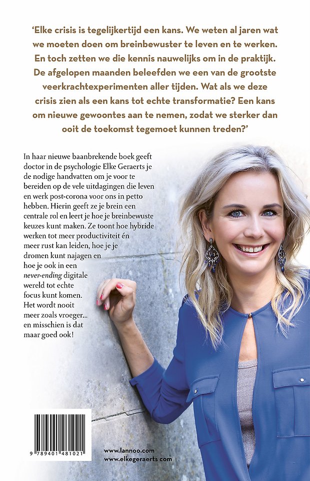 In haar nieuwe baanbrekende boek geeft doctor in de psychologie Elke Geraerts je de nodige handvatten om je voor te bereiden op de vele uitdagingen die leven en werk post-corona voor ons in petto hebben. Hierin geeft ze je brein een centrale rol en leert je hoe je breinbewuste keuzes kunt maken. Ze toont hoe hybride werken tot meer productiviteit én meer rust kan leiden, hoe je je dromen kunt najagen en hoe je ook in een never-ending digitale wereld tot echte focus kunt komen. Het wordt nooit meer zoals vroeger... en misschien is dat maar goed ook!