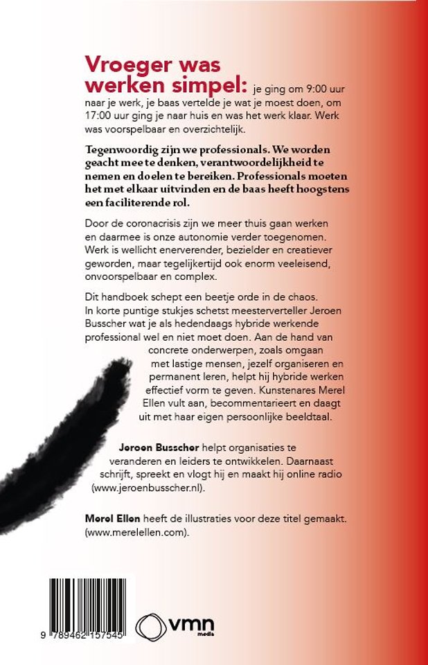 Dit handboek schept een beetje orde in de chaos. In korte puntige stukjes schetst meesterverteller Jeroen Busscher wat je als hedendaags hybride werkende professional wel en niet moet doen. Aan de hand van concrete onderwerpen, zoals omgaan met lastige mensen, jezelf organiseren en permanent leren, helpt hij hybride werken effectief vorm te geven.