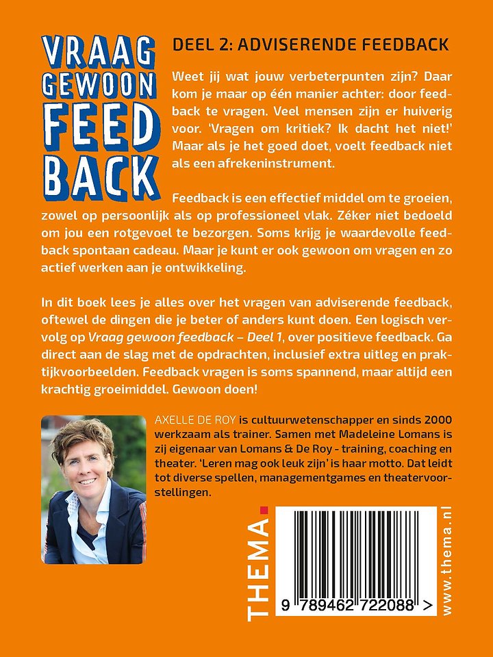 In dit boek lees je alles over het vragen van adviserende feedback, oftewel de dingen die je beter of anders kunt doen. Een logisch vervolg op Vraag gewoon feedback – Deel 1, over positieve feedback. Ga direct aan de slag met de opdrachten, inclusief extra uitleg en praktijkvoorbeelden. Feedback vragen is soms spannend, maar altijd een krachtig groeimiddel. Gewoon doen!