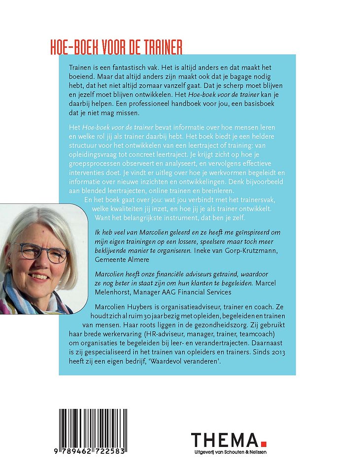 Dit Hoe-boek voor de trainer helpt je daarbij. In deze herziene versie besteedt Marcolien meer aandacht aan online trainen. Welke tools zijn er? Wat maakt online leren en trainen anders en hoe zorg je voor een impactvol leertraject? Het Hoe-boek voor de trainer is een professioneel handboek voor trainers, boordevol theorie en uitleg over het trainersvak.