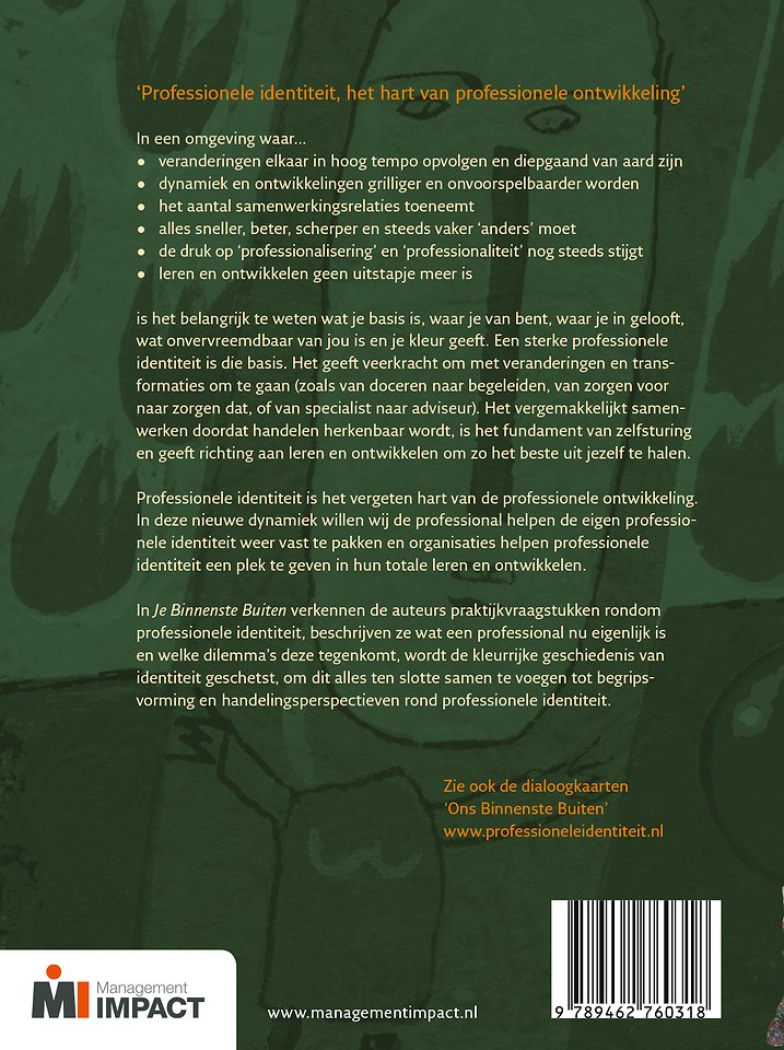 Genomineerd voor Managementboek van het Jaar 2016. Meer informatie over de verkiezing en het winnende boek. In een omgeving waar... - veranderingen elkaar in hoog tempo opvolgen en diepgaand van aard - dynamiek en ontwikkelingen grilliger en onvoorspelbaarder worden - het aantal samenwerkingsrelaties toeneemt - alles sneller, beter, scherper en steeds vaker 'anders' moet - de druk op 'professionalisering' en 'professionaliteit' nog steeds stijgt - leren en ontwikkelen geen uitstapje meer is ... is het belangrijk te weten wat je basis is, waar je van bent, waar je in gelooft, wat onvervreemdbaar van jou is en je kleur geeft. Een sterke professionele identiteit is die basis. Het geeft veerkracht om met veranderingen en transformaties om te gaan (zoals van doceren naar begeleiden, van zorgen voor naar zorgen dat, of van specialist naar adviseur). Het vergemakkelijkt samenwerken doordat handelen herkenbaar wordt, is het fundament van zelfsturing en geeft richting aan leren en ontwikkelen om zo het beste uit jezelf te halen. Professionele identiteit is het vergeten hart van de professionele ontwikkeling. In deze nieuwe dynamiek willen wij de professional helpen de eigen professionele identiteit weer vast te pakken en organisaties helpen professionele identiteit een plek te geven in hun totale leren en ontwikkelen. In 'Je Binnenste Buiten' verkennen de auteurs praktijkvraagstukken rondom professionele identiteit, beschrijven ze wat een professional nu eigenlijk is en welke dilemma's deze tegenkomt, wordt de kleurrijke geschiedenis van identiteit geschetst, om dit alles ten slotte samen te voegen tot begripsvorming en handelingsperspectieven rond professionele identiteit. Bij dit boek zijn 70 dialoogkaarten ontwikkeld: 'Ons Binnenste Buiten'.