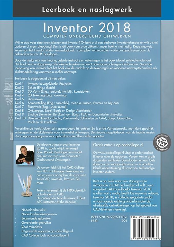 De nieuwe uitgave over Inventor 2018 is, zoals altijd, verzorgd door de gerenommeerde schrijver Ir. Ronald Boeklagen en maakt deel uit van zijn serie Computer Ondersteund Ontwerpen.