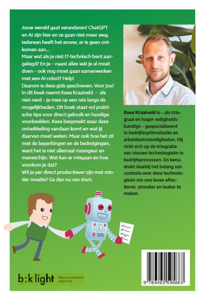 In dit boek neemt Kees Kraaiveld – als niet-nerd – je mee op een reis langs de mogelijkheden. Dit boek staat vol praktische tips voor direct gebruik en handige voorbeelden. Kees bespreekt waar deze ontwikkeling vandaan komt en wat jij daarvan moet weten. Maar ook hoe het zit met de beperkingen en de bedreigingen, want het is niet allemaal rozengeur en maneschijn. Wat kan er misgaan en hoe voorkom je dat?
