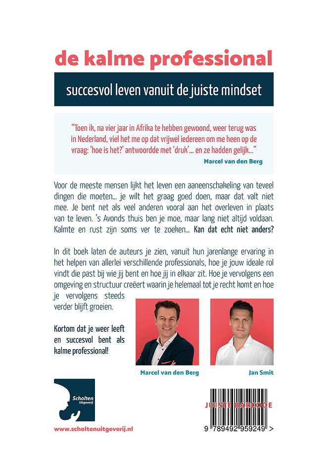 In dit boek laten de auteurs je zien, vanuit hun jarenlange ervaring in het helpen van allerlei verschillende professionals, hoe je jouw ideale rol vindt die past bij wie jij bent en hoe jij in elkaar zit. Hoe je vervolgens een omgeving en structuur creëert waarin je helemaal tot je recht komt en hoe je vervolgens steeds verder blijft groeien. Kortom dat je weer leeft en succesvol bent als kalme professional!