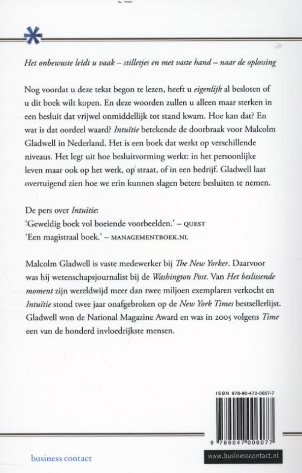 'Intuïtie' betekende de doorbraak voor Malcolm Gladwell in Nederland. Het is dan ook een boek dat werkt op verschillende niveaus. Het is een boek dat uitlegt hoe besluitvorming werkt: in het persoonlijke leven maar ook op het werk, op straat of in een bedrijf. Gladwell legt overtuigend uit hoe we erin kunnen slagen betere besluiten te nemen.